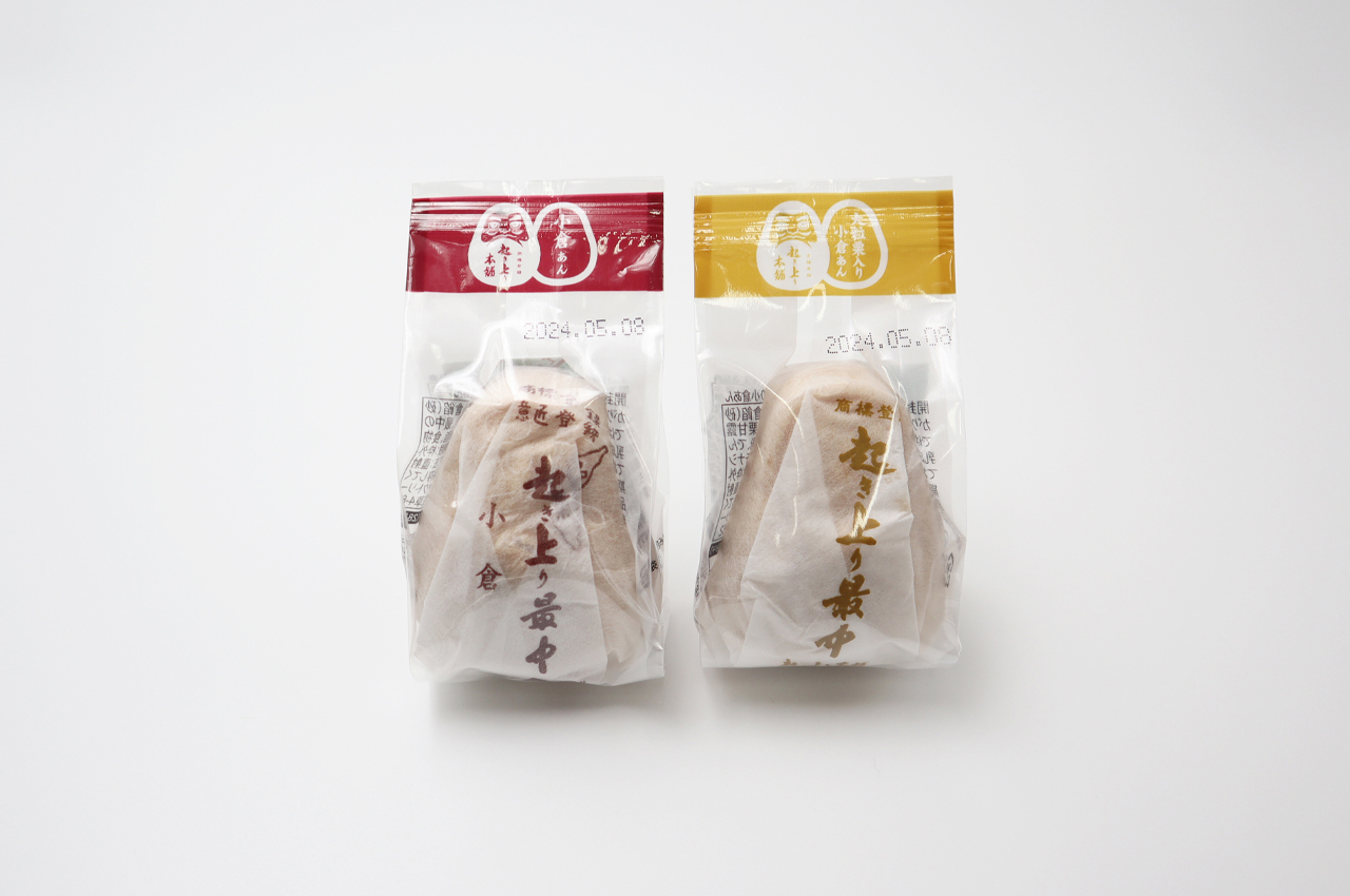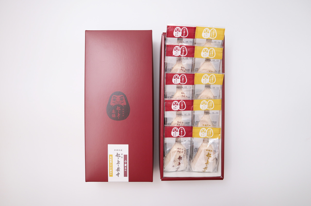 大粒、等級の高いものを贅沢に使用し、丁寧に炊き上げた味自慢の小倉餡を、縁起の良いだるまの形をした、もち米でぱりっと焼き上げた最中の皮で優しく包みました。