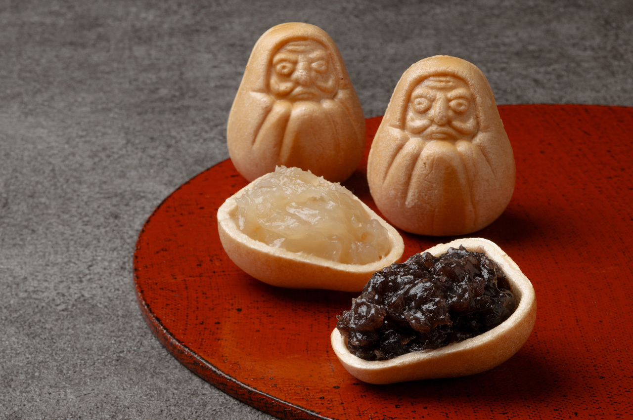 「起き上り最中」は、戦後まもなく岐阜・柳ヶ瀬で生まれた、縁起の良いだるまの形をした最中です。